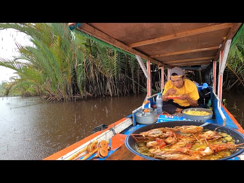 Masak udang telur asin setelah mancing saat hujan langsung di perahu#HTML